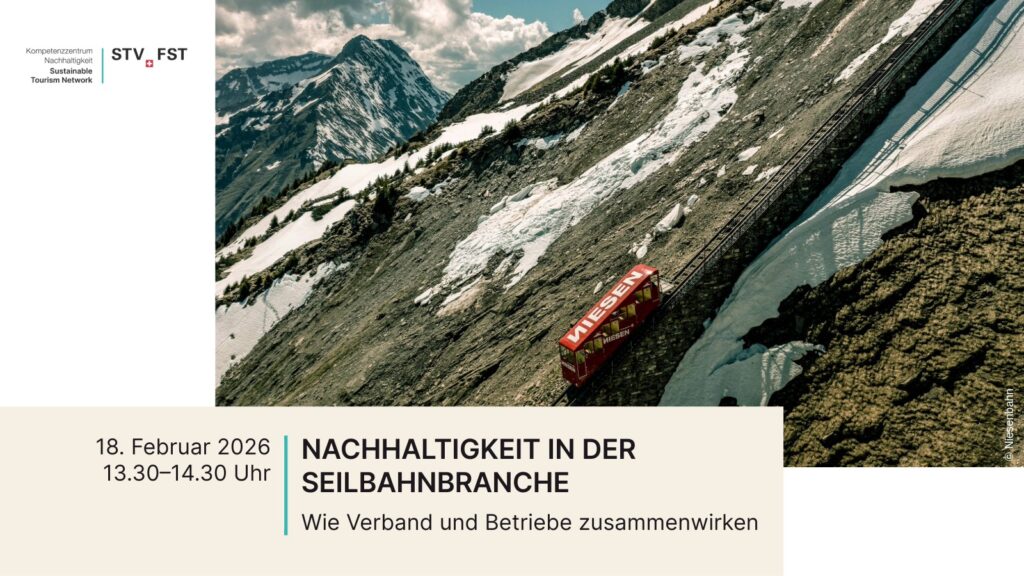 Am Mittwoch, 18. Februar 2026 von 13:30–14:30 Uhr findet das Webinar «Nachhaltigkeit in der Seilbahnbranche: Wie Verband und Betriebe zusammenwirken» statt.
